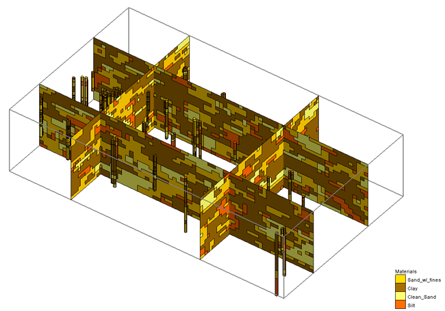 T-PROGS 软件用于对钻孔数据进行转移概率地质统计。T-PROGS 软件的输出是一组 N 个材料集合,位于一个三维网格上。每个材料集合都与钻孔数据相匹配,材料比例和钻孔间的过渡遵循钻孔数据中观察到的趋势。这些材料集可用于 MODFLOW 的随机仿真。TPROGS 软件生成的样本材料集如下所示。T-PROGS 软件还可以用于生成 HUF 包的多个输入数据集。T-PROGS 软件采用基于过渡概率的地统计方法,通过三维马尔可夫链建模空间变异,建立指示性 cokriging 方程,并制定模拟退火的目标函数。相较于传统的指示克里金方法,过渡概率方法有多个优势。首先,转移概率方法考虑非对称并置趋势,如向上精细的序列。其次,过渡概率方法具有将地质解释纳入相互相关空间变异发展的概念框架。此外,转移概率方法并不全部依赖经验曲线拟合来构建指示(交叉)变异函数模型。这很有利,因为地质数据通常仅足以建立垂直方向空间变异模型。过渡概率方法为地质学提供了一个概念框架,以理解一个简单紧凑的数学模型—马尔可夫链。这是通过将基本可观测属性—平均长度、材料比例、各向异性和并置—与马尔可夫链模型参数联系起来实现的。